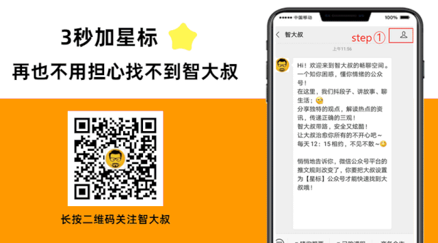 功能介绍:有智有料有格调!这里是智大叔公众号,在这里,我们一本正经的抖段子,娓娓道来的讲故事,敞开心扉的聊生活~! 让你思想有智,人生有料,生活有格调!智大叔带路,安全又炫酷!