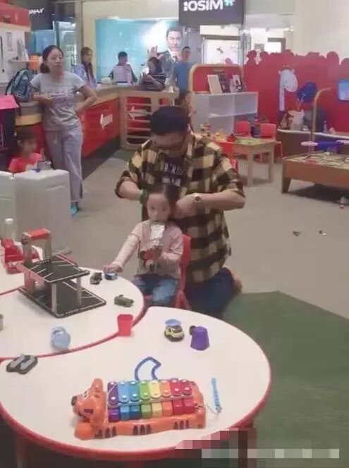 温兆伦蹲在地上为自己的女儿梳头,也是一个女儿控了。