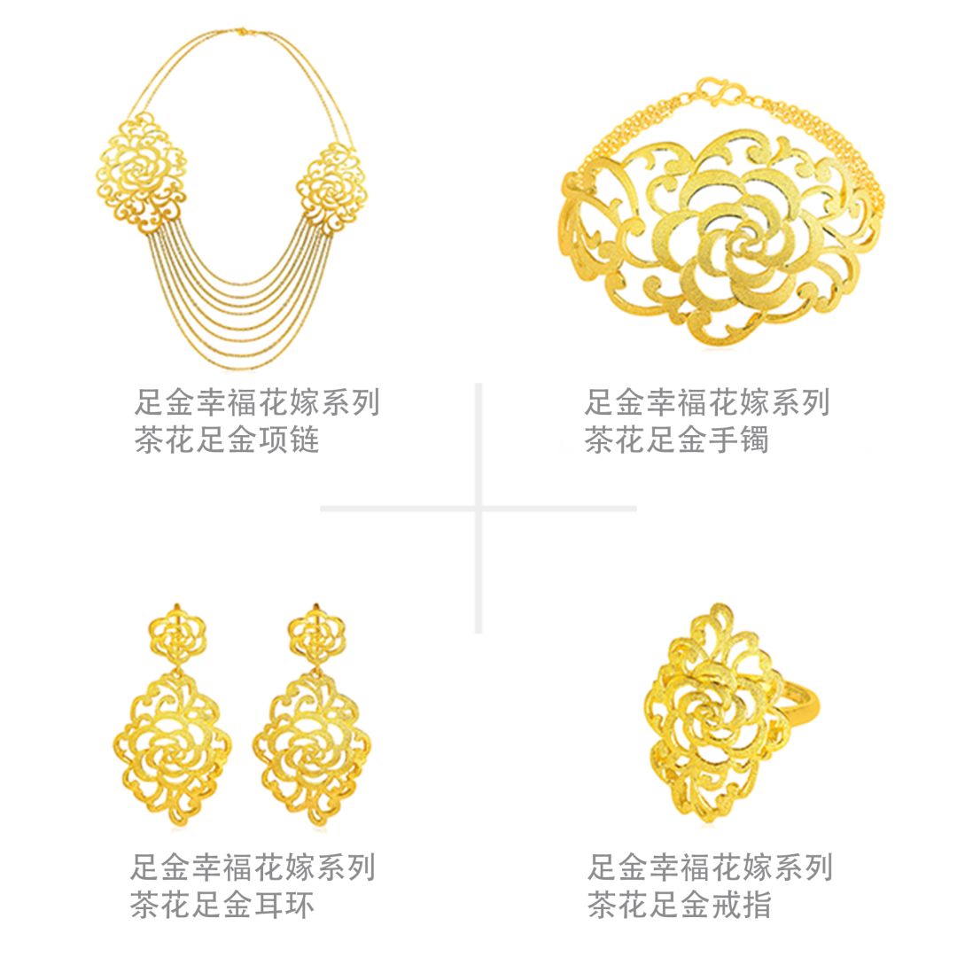幸福花嫁系列精巧地以深受女性钟爱的中西式花卉为设计灵感,融入到中式足金婚嫁系列中,有别于一般传统婚嫁的设计,为传统金饰注入现代时尚感。此系列分别以中式的茶花以及西式的玫瑰花为灵感,寓意婚姻生活如花灿烂,缤纷多姿。