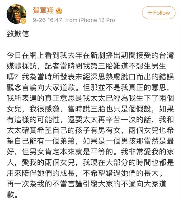 对此,9月26日下午,贺军翔在微博发布致歉信,为当时所发表未经深思熟虑脱口而出的错误观念言论向大家道歉,称那并非自己真正的意思,本意是感谢太太为自己生下两个女儿,当时说第三胎也只是假设,“我和太太确实希望自己的孩子有男有女,两个女儿也希望自己能有一个弟弟,如果是一个男孩那当然是最好,但男女肯定本来就是平等的”。