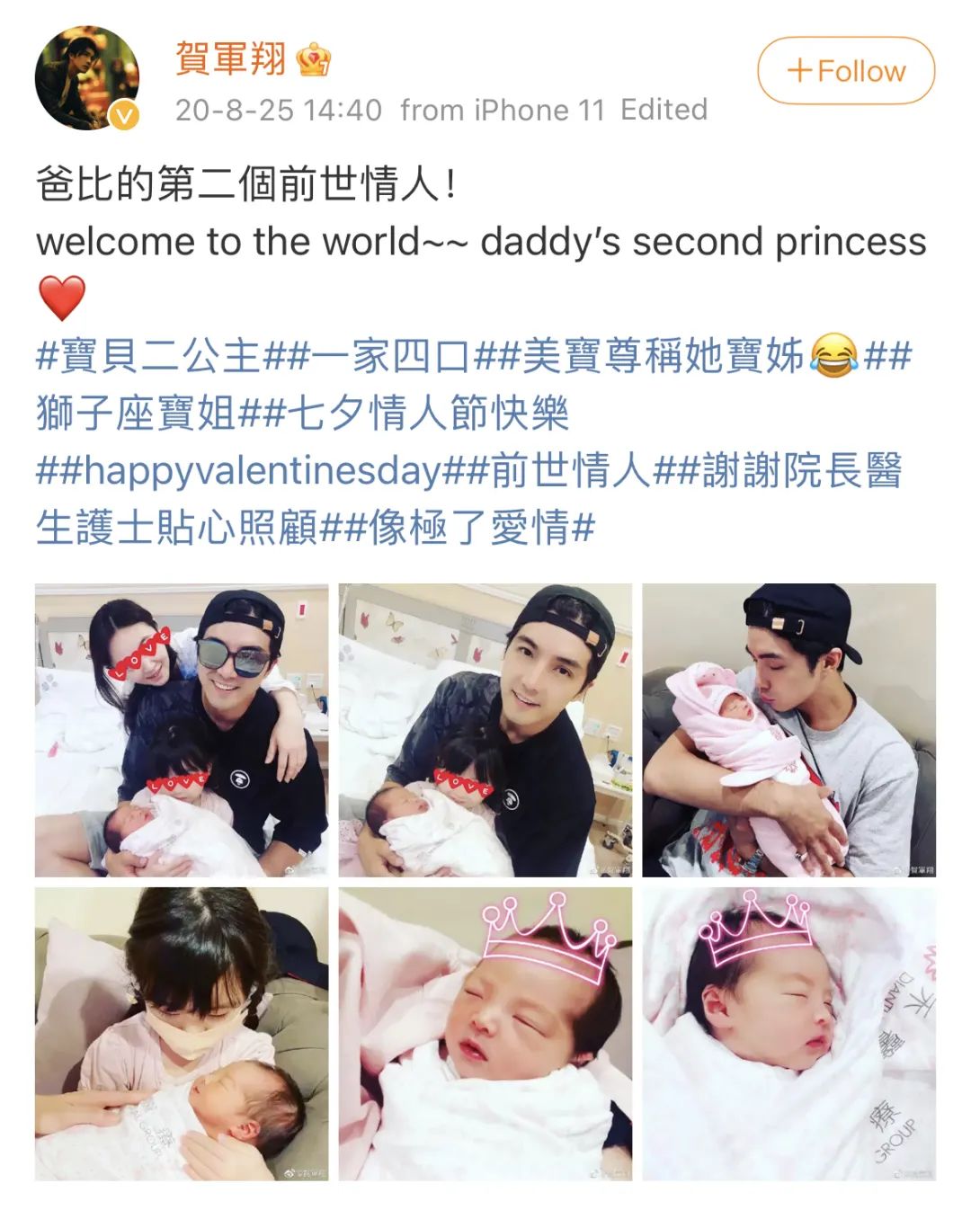 去年8月,贺军翔与妻子二胎得女时,他曾在宣布消息时带上了“狮子座宝姐”的话题,后据台媒报道,贺军翔去年9月出席某活动时透露,妻子第二胎是提前两周剖腹产,只因为夫妻二人“比较怕处女座的龟毛,不想生处女座宝宝,所以提前1、2周,变成狮子座”。
