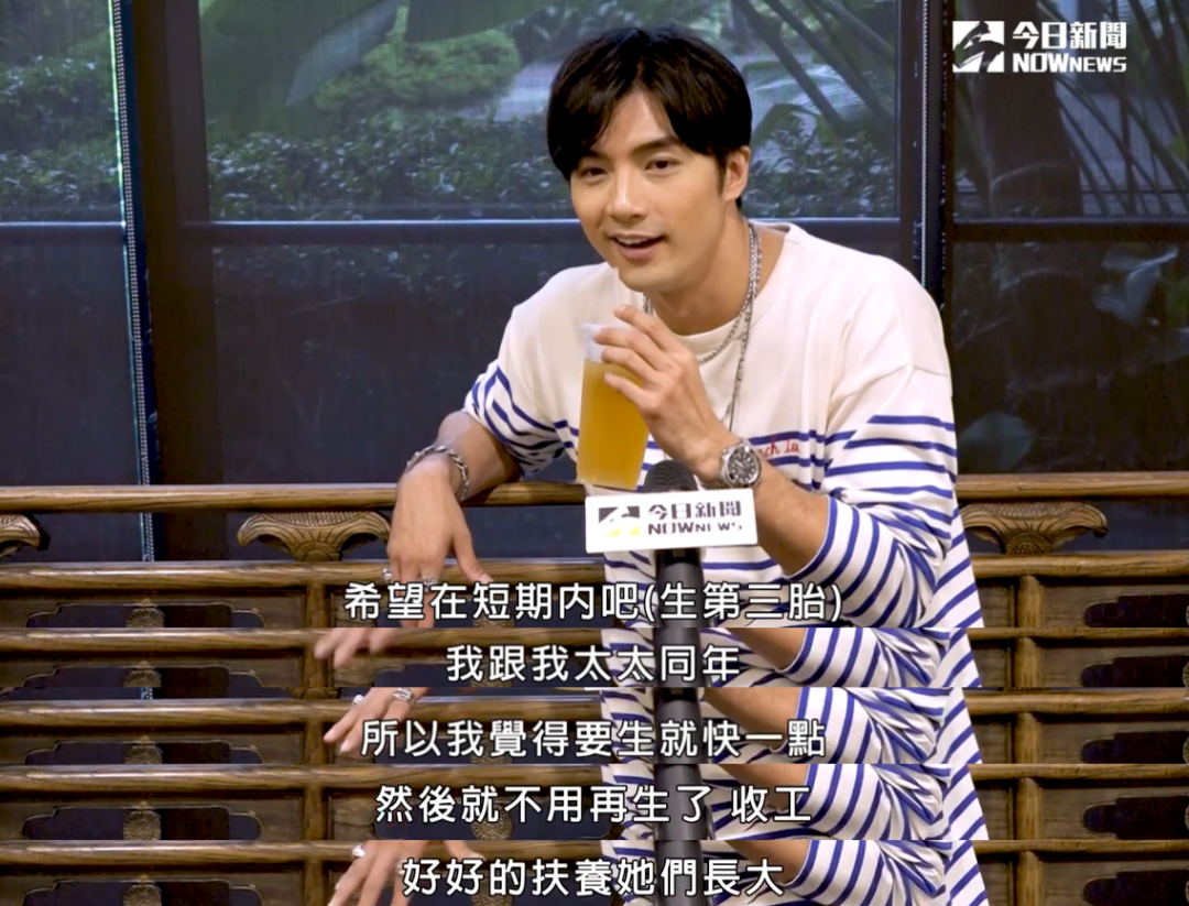 采访中,贺军翔透露,希望在短期内要第三胎,因为妻子和他同年。“所以我觉得要生就快一点,然后就不用再生了,收工,好好地抚养他们长大,如果再拖,大宝二宝三宝差太多岁其实我觉得也很累,都要重新再来一次……一岁以前的那段时期比较辛苦。”
