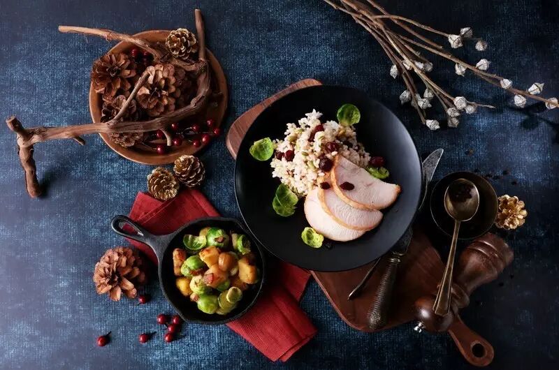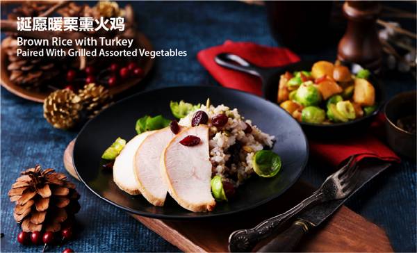 将最具有节日气氛的火鸡,采用烟熏制法,咸香可口,再搭配暖香烤栗与孢子甘蓝的色彩点亮这份美味,蔓越莓、培根的加入让原本平凡的糙米更惊艳。