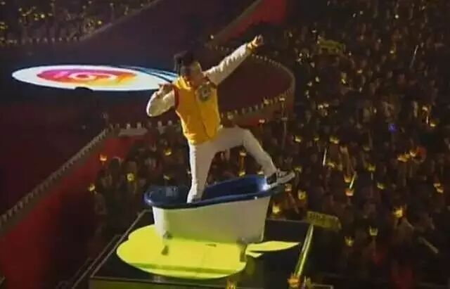 伴着“星球大战”的配乐,他摆出超人的姿势,踩着一座浴缸穿过台下黄色的灯海与尖叫的人潮,冲向舞台另一端。他梳着过于高耸的莫西干,在舞台换上纯白西装,眼线还不够撩人,纹身尚未扩散到裸露的肩膀和后颈。他选中一首2001年的老歌,与大屏幕中的那个13岁Hip-Hop少年一同唱到:“我13岁,在这个世界太过年轻,但在我的rhyme中,让我们一起沉醉。”