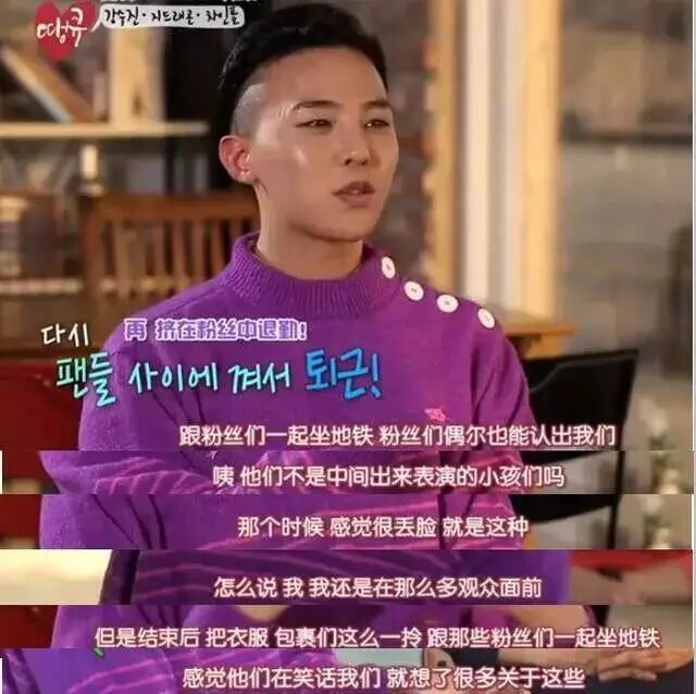 GD曾讲过练习生时期的一段经历:演出结束后,跟来看演出的人一起坐地铁回去的路上听到了“那不是刚刚表演的孩子吗”的嘀咕。“尽管在舞台上很帅气,但疲惫无力地提着服装包,还是会觉得丢脸。”