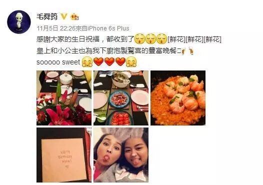 娱乐圈最近也是喜事连连哦,昨日是毛舜筠的“牛一”生日,人缘极好的她可是收到了不少圈中好友的祝福,例如陈法蓉、蔡少芬...而毛舜筠本人还在社交网络和网友一同分享自己的喜悦,po出了自己的生日大餐以及和女儿的合照不单止,更不忘”鬼马“留言称”皇上和小公主也为我下厨炮制惊喜的丰富晚餐,soooo sweet。“