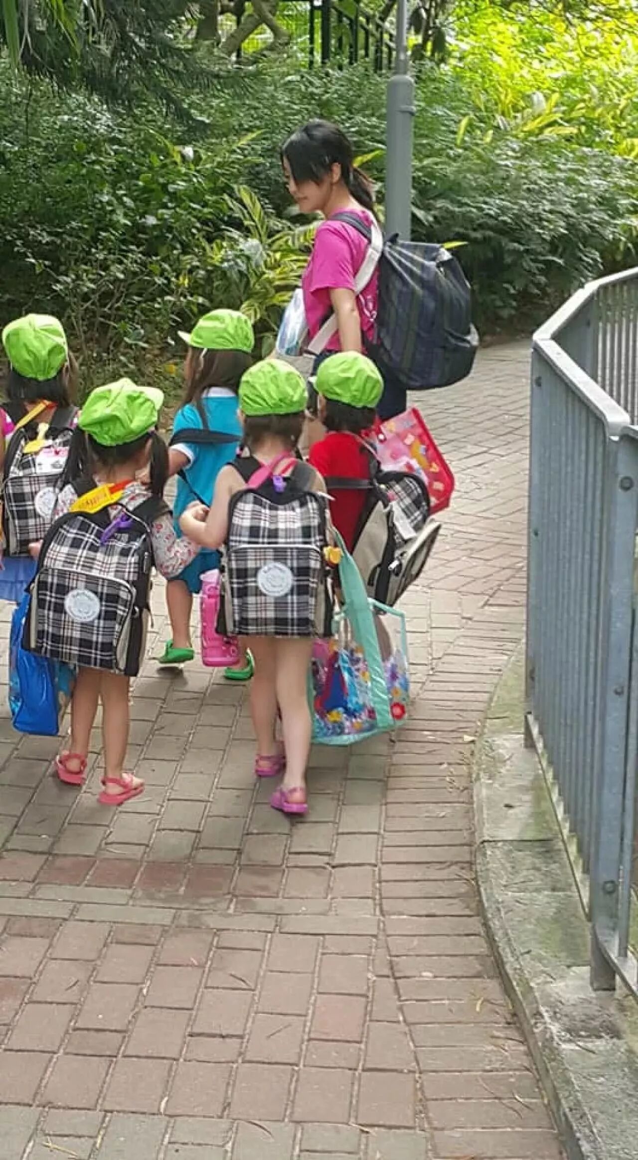 回去的路上,统一着装的孩子们各自拎着自己的物品,手拉手,相互照顾,安静地跟在老师身后。