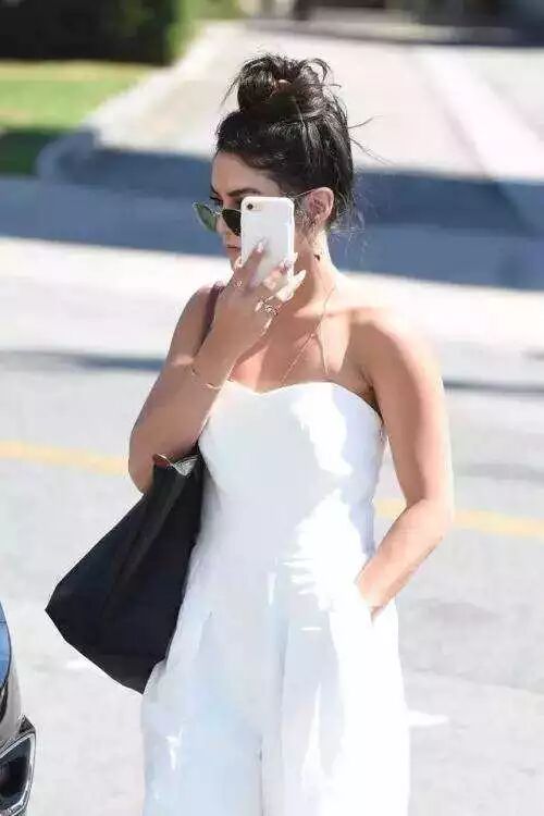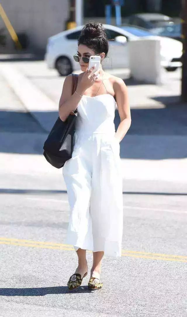 近日Vanessa出街,清新白色的连体裤搭配丸子头超级减龄的少女模样。▼