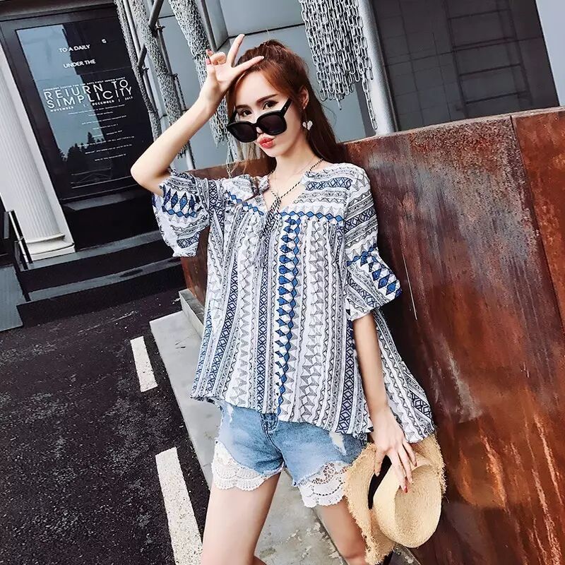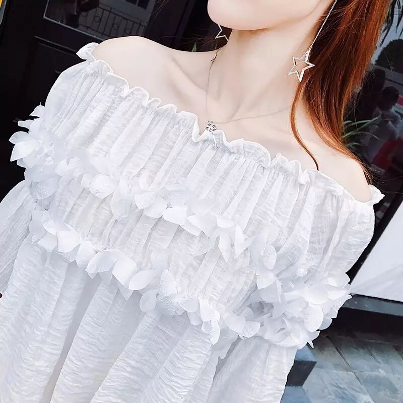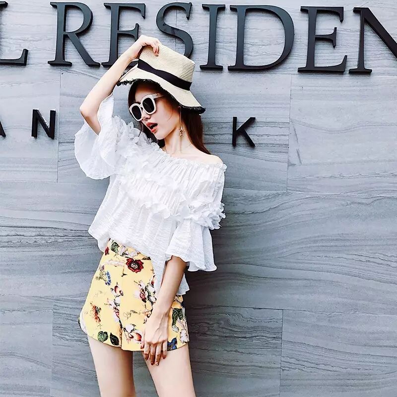 白色一字领棉麻上衣,喇叭袖搭配层层花卉花朵,宽松显瘦,除了像Vanessa搭配长裙之外也可以搭配短裤~