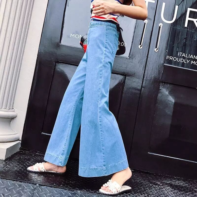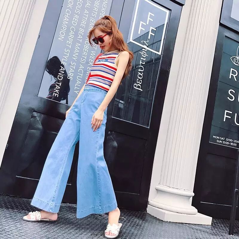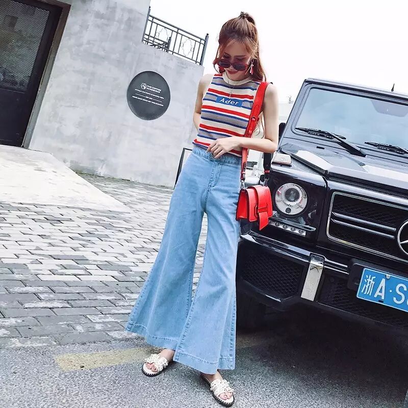 牛仔阔腿裤腰部微收让你看起来更显纤瘦苗条,清爽的水洗蓝色,舒适透气。你们会说长裤会不会热?其实大裤脚的裤子自带鼓风属性,走起路来一阵风,连空调小电扇都省了。