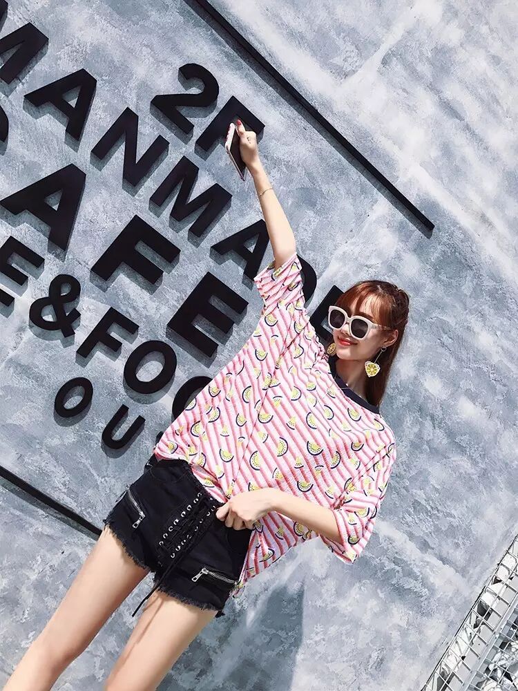 吊带露肩上衣,可调节细肩带,黄色菠萝图案印花排列规整,可爱少女心,胸前亮片交叉修饰胸型,宽松版型,搭配白色短裤就很好看啦。
