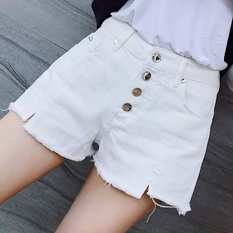 白色的一款牛仔裤,在裤脚有磨毛的处理。裤子的门襟我们做了扣子的设计,非常潮流,既有一点小朋克的感觉又具有设计感。