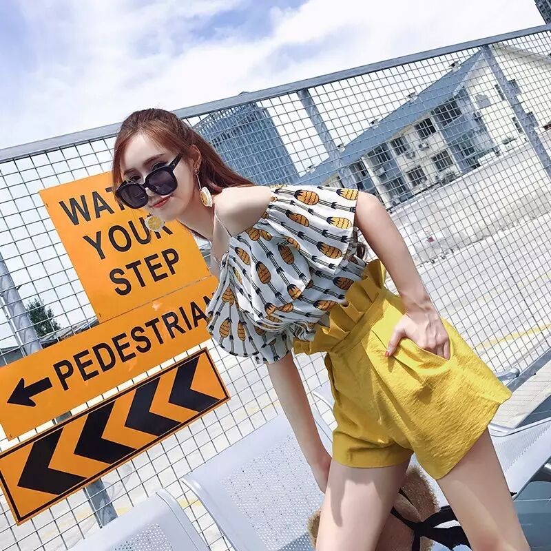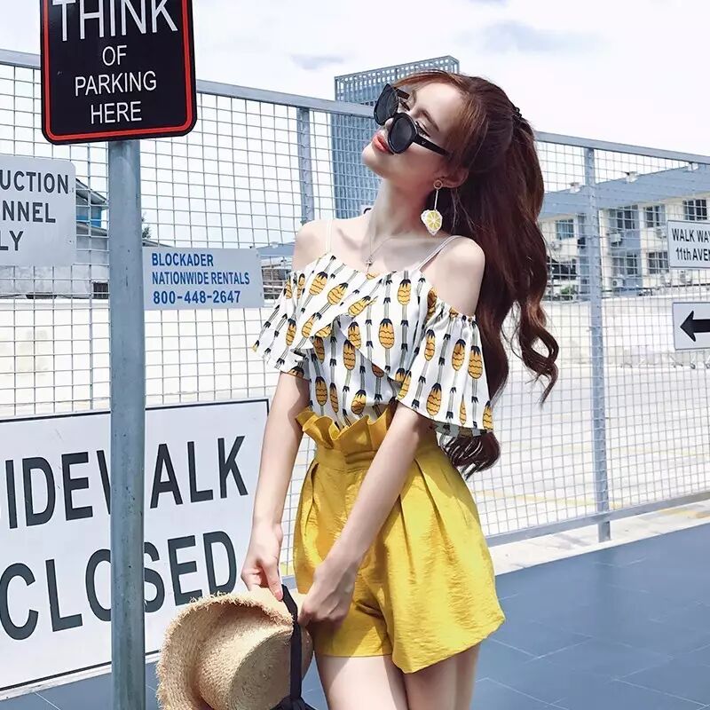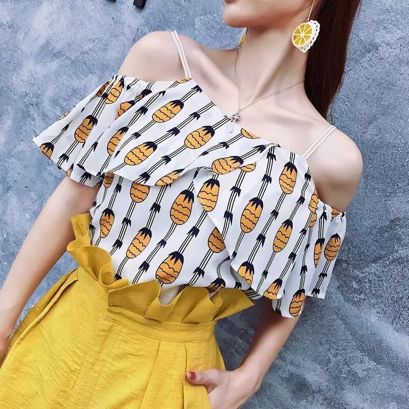 【西西小可 菠萝印花露肩吊带雪纺衫】