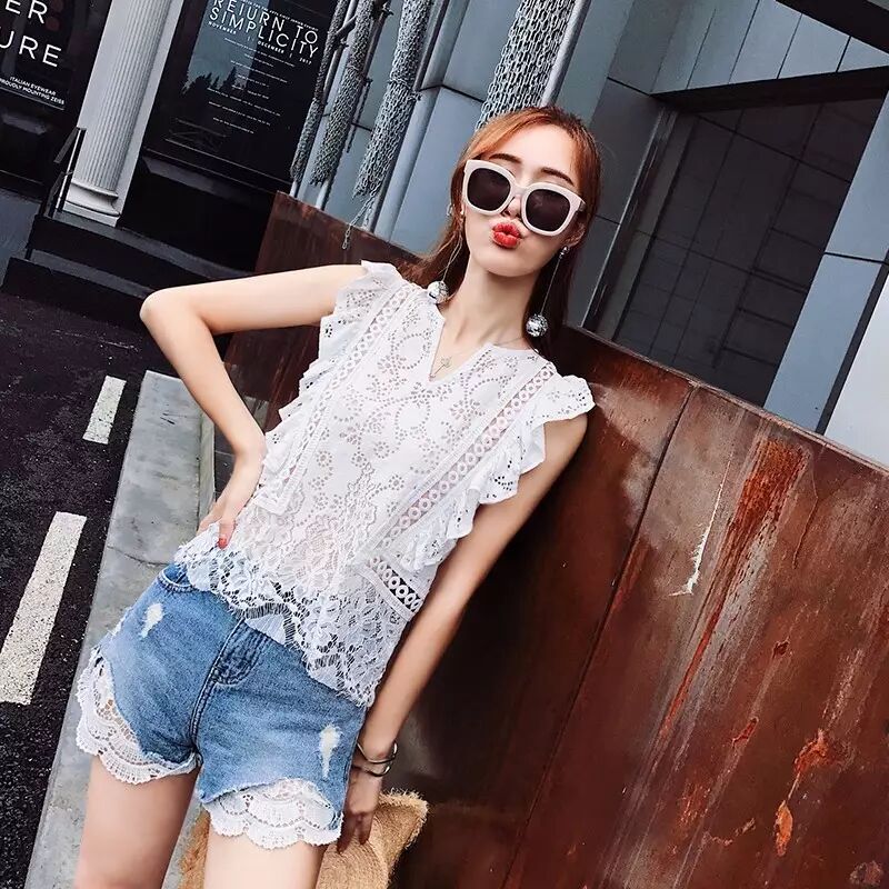 牛仔短裤偏a字型的设计,将细的腰围处展现无遗。给人更多的视觉空间巧妙的遮住了大腿曲线。加上拼厚蕾丝等时尚元素的加入谁穿谁就是小公举无疑。