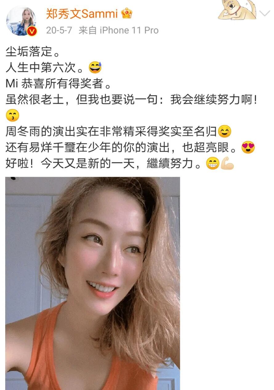 到了2020年,郑秀文凭《花椒之味》和《圣荷西谋杀案》一人占据两席提名,但再一次与奖项失之交臂,风头正劲的周冬雨(《少年的你》)拿下影后。