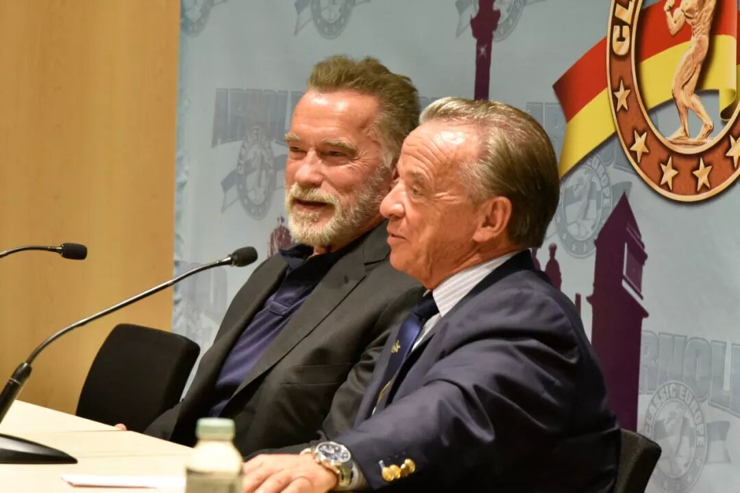 阿诺德·施瓦辛格(中)与IFBB主席拉斐尔(左)将同时亲临会场,并与您共同参观展会。