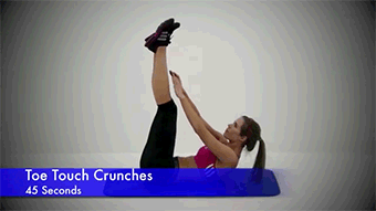 5、躺在瑜伽垫上,双腿伸直抬起,双臂斜上方伸直,做卷腹动作。