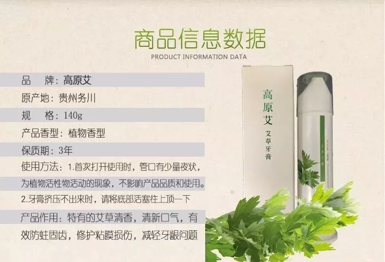 贵艾以艾草为原料,研制了一款草本植物牙膏。精选贵州高原海拔1200米的艾草,萃取其精华,有艾叶香气,能清爽洁净牙齿,去除口腔异味,损伤恢复,防蛀固齿。没有添加氟、芳香剂、染色剂,发泡剂,在清洁牙齿的同时对牙齿没有任何伤害的一款健康艾草牙膏。