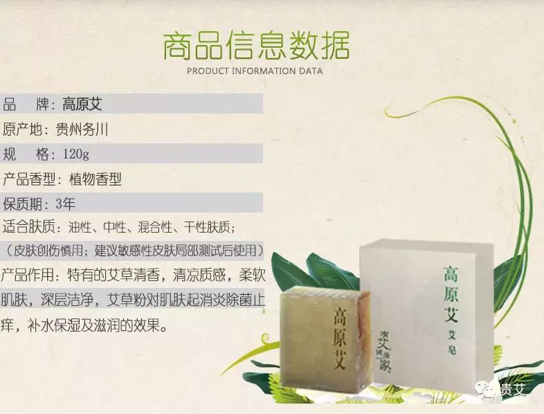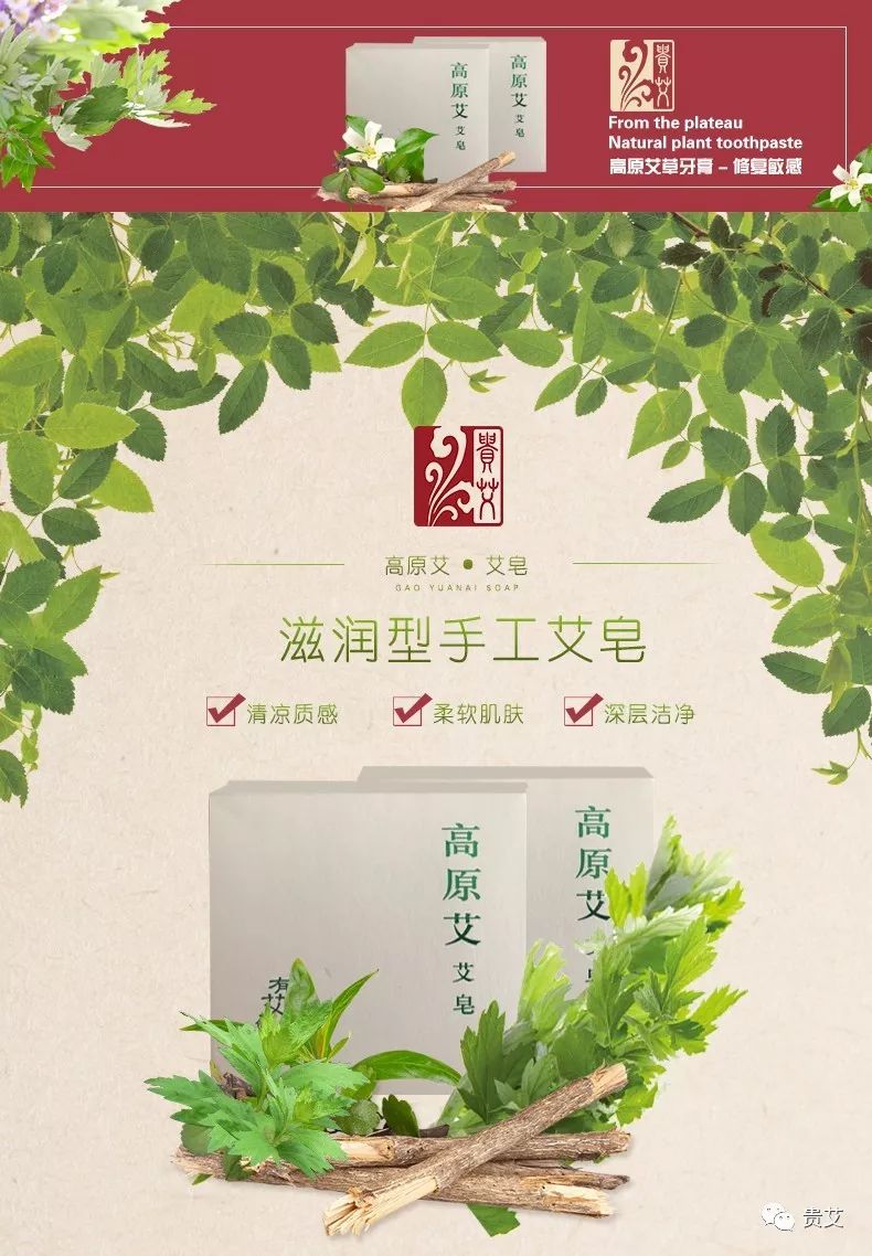 贵艾根据这一理念,研制了一款以艾草为原料制成的艾皂,是一款滋润型手工艾皂,精选贵州高原海拔1200米艾草,萃取其精华,特有艾草的清香,艾叶拥有独特的渗透力,可以深沉清洁肌肤。添加了艾草草本精华,对肌肤起到消炎除菌止痒,补水保湿及滋润的效果,是一个很好的适用于我们日常肌肤护理、清洁的理想产品。
