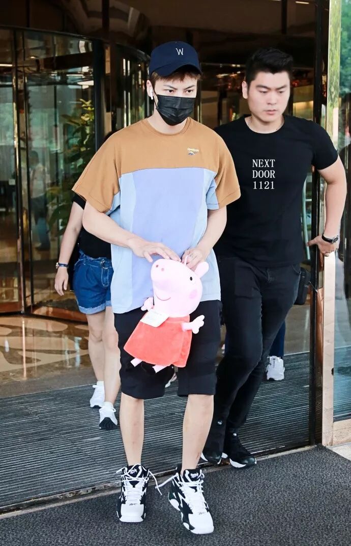 身穿撞色宽松T恤,脚踩潮鞋不系鞋带,手里还拎着一只粉嫩嫩的小猪佩奇,非常活力可爱的一身搭配了。