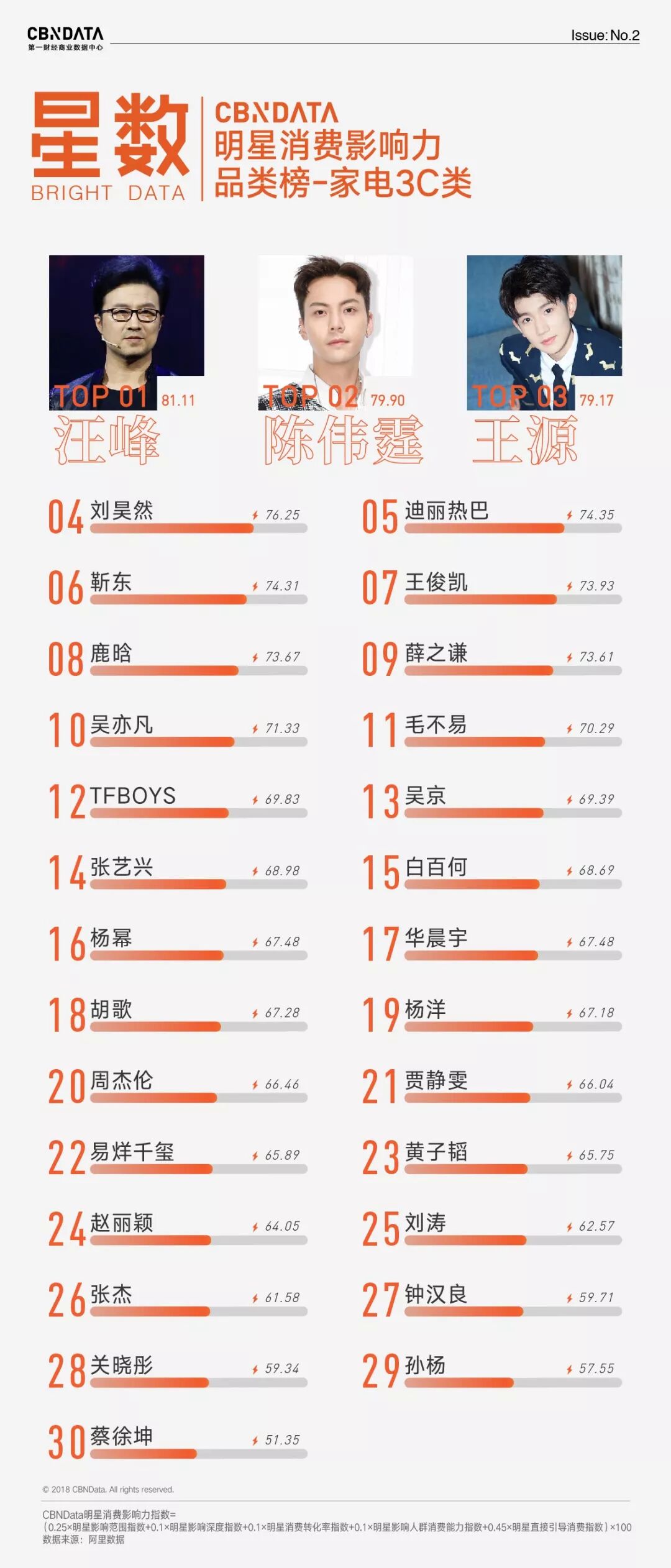 在第一财经商业数据中心(CBNData)发布的星数——2018二季度“CBNData明星消费影响力榜”中,陈伟霆位列家电3C品类榜的第二名。