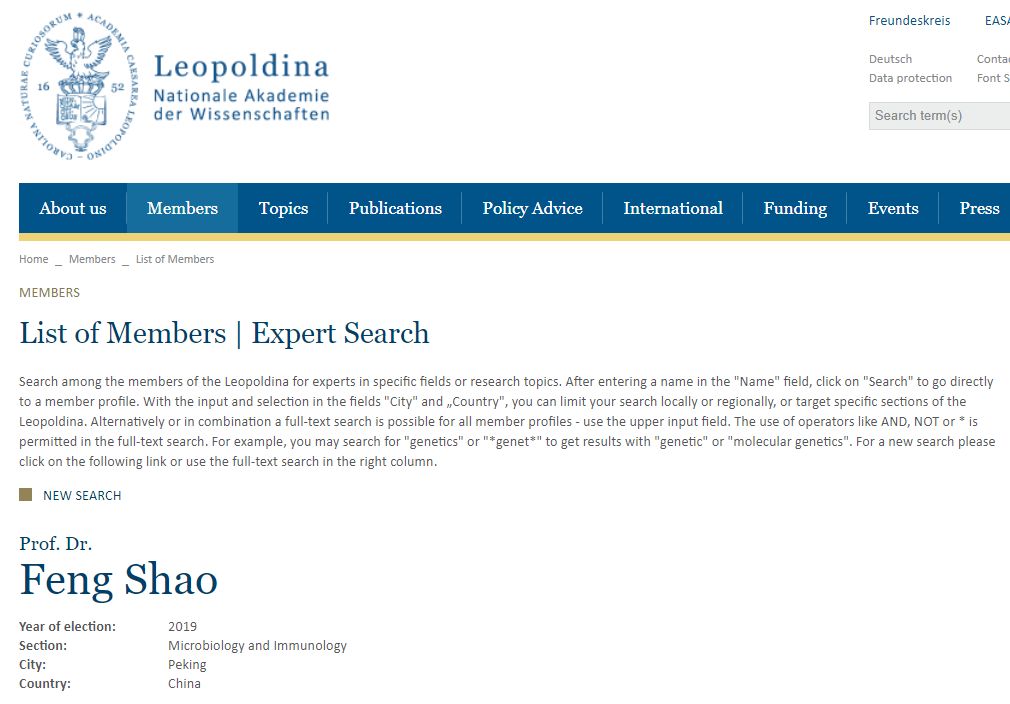 日前,据德国国家科学院(German National Academy of Sciences)官方网站显示,北京生命科学研究所(NIBS)资深研究员、科研副所长、中国科学院院士邵峰博士新当选为2019年度德国国家科学院院士。