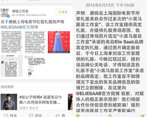 而唐嫣早年穿山寨礼服也不是第一次了,比如在剧里穿了打版改制Elie saab 的裙子。