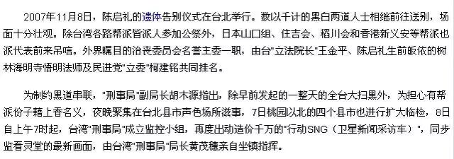 陈楚河曝光童年生活,原来竹联帮太子爷是这样过的 娱乐天天闻 港台男星 2019-11-29 11:46:59 1476 创作不易,用心坚持,欢迎请BaGua喝几杯爱心咖啡!打赏并支持本文 打赏并删除本文 人在江湖飘呀,哪能不挨刀呀?《武林外传》的这句恶搞台词,应该是台湾演员陈楚河的心声吧!最近网上突然流传一种说法,称陈楚河是王思聪都不敢惹的人,这个娱乐圈没有人敢得罪他!标题很吓人,估计王思聪自己也是一脸懵逼——关我屁事!其实也没什么,不就是因为陈楚河的父亲陈启礼(下图)是台湾“竹联帮”的精神领袖吗?他从小在一群江湖大佬的照顾下成长,确实见过不少腥风血雨,不过也就仅此而已。他接受访问,提到小时候与父亲相处的往事,听起来还挺温馨的,“竹联帮太子爷”的人生,偶尔也有属于自己的无奈。读小学时听广播,才发现自己父亲入狱因为身份特殊,陈楚河从小挨过不少闲言闲语,经父亲好友介绍入娱乐圈发展,他被说成靠父荫;陈父2007年逝世,披麻戴孝的陈楚河曝光率急增,人们又说他借亡父上位……当然,这些都只是网上言论,没有人敢当着他的面挑衅,你……懂的!事实上,陈楚河进娱乐圈的确全靠爸爸的人脉,2006年,他在父亲好友、“四叔”吴敦(当年与陈启礼一起犯下“江南案”的杀手之一)的安排下拍摄《大灌篮》。刚出道时,父亲特意和他一起露面接受电视台采访,帮他打响头炮,陈楚河还记得,当陈启礼发话时,主持人都紧张得不敢说话。“当时主持人致电身在柬埔寨的爸爸时,以为他很凶,差点说不出话!没想到他很慈爱地说:‘每个人都有自己的路要走,你可以选择平淡无奇,也可以选择多姿多彩,我支持他的决定。’爸爸还说,在他眼里,我比一般人要纯真,让我很感动。”人人都敬畏陈启礼,连带着也害怕他的长子陈楚河,因此许多人都不敢靠近他。他努力为自己洗白,“其实父母在我1岁时就离婚了,我是直到小学时,才隐约了解父亲是江湖上赫赫有名的大哥。其实爸爸是很有趣的人,他一有时间就和我玩。我也因为爸爸爱下象棋,所以才拼命学棋,就是为了要和爸爸一决胜负。”虽然父亲在台湾“江湖”上赫赫有名,但陈楚河说,他7岁以前完全不晓得爸爸是做什么的,直到1984年哄动一时的“江南案”。“在我小学一年级时,某一天,爸爸突然跑到学校找我。我现在已经忘了他说什么,他最后只给了我50元。那天开始,爸爸突然不见了,当时家人与叔叔们便预测,爸爸已经出事了。”陈楚河又记得,之后的某天中午在学校吃饭时,广播报道着“江南案”,他听到了爸爸的名字,就知道爸爸已经入狱了。那时他才领悟到:“我爸爸的身份很特殊,他不是普通的爸爸。”再见到父亲时,已经是4年之后,蒋经国逝世百日“大赦”,陈启礼获赦出狱后重返竹联帮。虽然陈启礼经常不在陈楚河身边,但父子关系一直很亲密,陈楚河的童年也没什么遗憾的。“他在狱中常常写信给我,他很可爱,还会剪下报纸的漫画贴在上面,鼓励我要好好念书,教我一些为人处世的道理。现在我还留着这些书信。”而且,父亲还会托“叔叔们”送很多礼物给陈楚河,包括金项链、金戒指,“但我收藏最多的反而是书信,因为它们才是真正的宝物……”他说。“我曾见过很多人拿着枪冲入屋……”父亲拥有非一般的江湖地位,陈楚河有一种特殊的神秘感。“因为爸爸的关系,也许一般人刚开始会对我产生好奇,让我很尴尬。例如我究竟有没有看过古惑仔?爸爸会不会打人?其实,电影的古惑仔拍得夸张了一点。无论爸爸做过什么,他从来没打过小孩!”这曾让他很不自在,同时,他努力要自己诚恳待人,自称从小到大不敢发脾气,而且待人接物都小心翼翼,免得被别人说闲话。看过他在《非凡搭档》的表现,他所言的“小心翼翼”,显然跟大家的标准不一样——那股强悍的霸气怎么都藏不住呀!陈楚河笑称,这个“太子爷”身份没为他捞到什么好处,小时候读书经常被人欺负,拍拖更曾遭女友狠甩,哪里有半点霸道总裁的风范。“刚入行拍《大灌篮》时,我和周杰伦、陈柏霖出去玩,我是受到女生冷落的那一个。在上海拍戏时,还有Fans以为我是陈柏霖的替身!哎!连吴叔叔(曾经的竹联帮杀手吴敦)也试过被人电话勒索60万呢,我就不会被人欺负吗?”不过,陈父临终前,曾告诉他,一有事就找奶奶,“爸爸说奶奶比他厉害,不知道该怎么办时,照奶奶的话做就没错!”不明觉厉呀!记者问他,小时候有没有见过黑帮仇杀,他一脸严肃说:“我曾见过很多人拿着枪冲入屋……哈哈!没有啦,大家可能都误会了,很多人以为别人都对我恭恭敬敬的,但其实太夸张了。在我小时候,父亲就教我要尊敬长辈,又怎会发生这样的事?”也许真的是港产片看多了,只要陈楚河在节目里皱眉或者冷笑,我就觉得随时会有几十个保镖从天而降,拿枪扫射……为了证明自己的“清白”,陈楚河还一直强调自己和父亲长期分开,他没受父亲太多影响。陈楚河刚出道时,工作量不大,并没有大红大紫。可是2007年10月,陈启礼病逝轰动台湾,当时身为长子的陈楚河四处奔走治丧,让其帅气的外型频频曝光,网上一时热论纷纷。经此一役,陈楚河那满脸胡子碴的“孝子形象”掳获了不少Fans,他反而因此星运大开。陈楚河也坦言:“因为爸爸的关系,我确实引起不少制作人的兴趣,得到很多好机会。本来我没什么代表作,但自此就挑大梁演偶像剧了!”经历丧父之痛后,陈楚河第一部挑大梁的