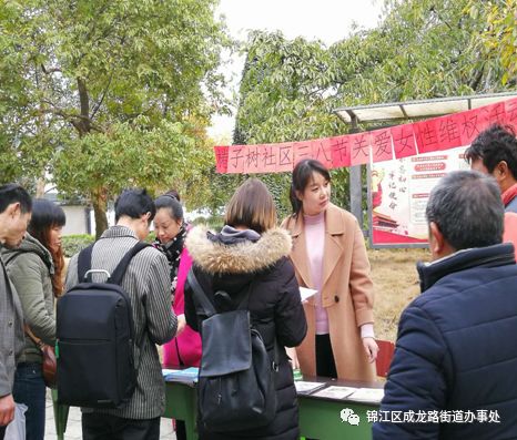 锦城逸景社区党员志愿者早早来到九九乐龄康养中心陪大妈们晒太阳、拉家常、听倾诉。棬子树社区妇联工作者、辖区志愿者到锦江区人力资源市场摆放宣传点,开展法律及妇女维权咨询及服务。经天社区邀请律师事务所的专业老师给辖区妇女讲解《妇女儿童权益保障法》、《婚姻法》等日常生活中涉及到的相关法律知识。粮丰社区携手辖区医疗服务机构开展女性健康义诊活动。香樟社区携手小区物业给女性居民们送上清晨的第一枝康乃馨。