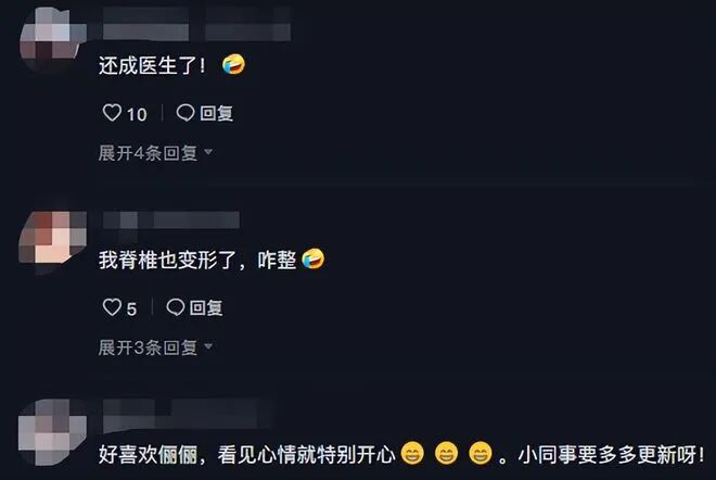 网友看见这样的孙俪,在下面评论说孙俪演戏还变成了医生。还有的更是直接在底下发问说他的脊椎也变形了,怎么办?是不是也想让孙俪来给你正正骨。还有的则是直接对着孙俪表白,说看见孙俪就心情好,希望以后可以多多更新。