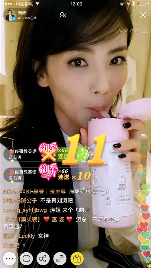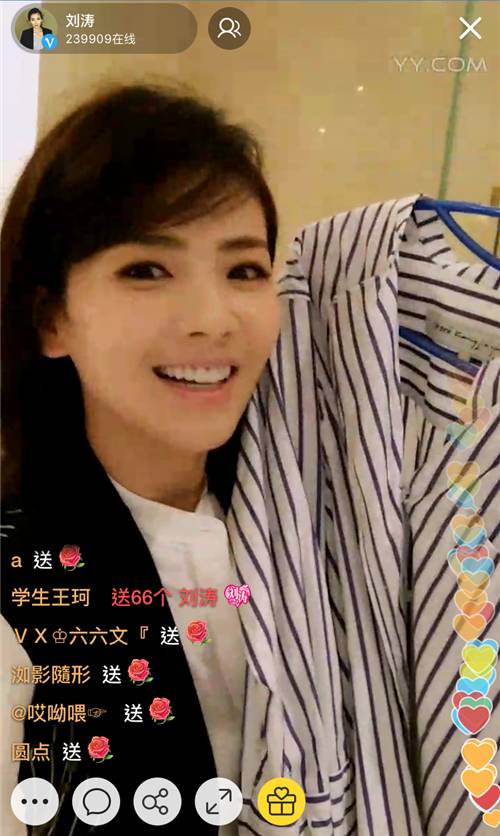 5月31日中午11:40,女神刘涛登陆YY直播给粉丝大派福利啦!本次直播有129.8万人同时在线观看。女神刘涛直播过程中一点不含糊,大谈时尚经、清唱4首经典歌曲、剧透《欢乐颂》《琅琊榜》第二季等。该直播爆棚轰动的其中一条信息是刘涛将《欢乐颂》中安迪的服装拿出来公开甩卖,竟然是为了筹集善款帮助一个患有先天性小儿麻痹症及又患上脊柱侧弯的平遥女孩“闫建星”。