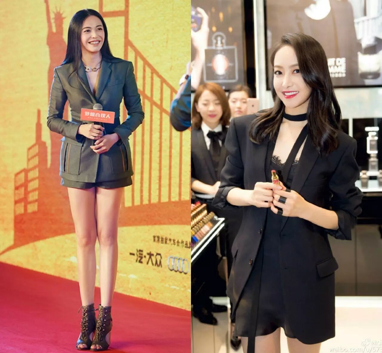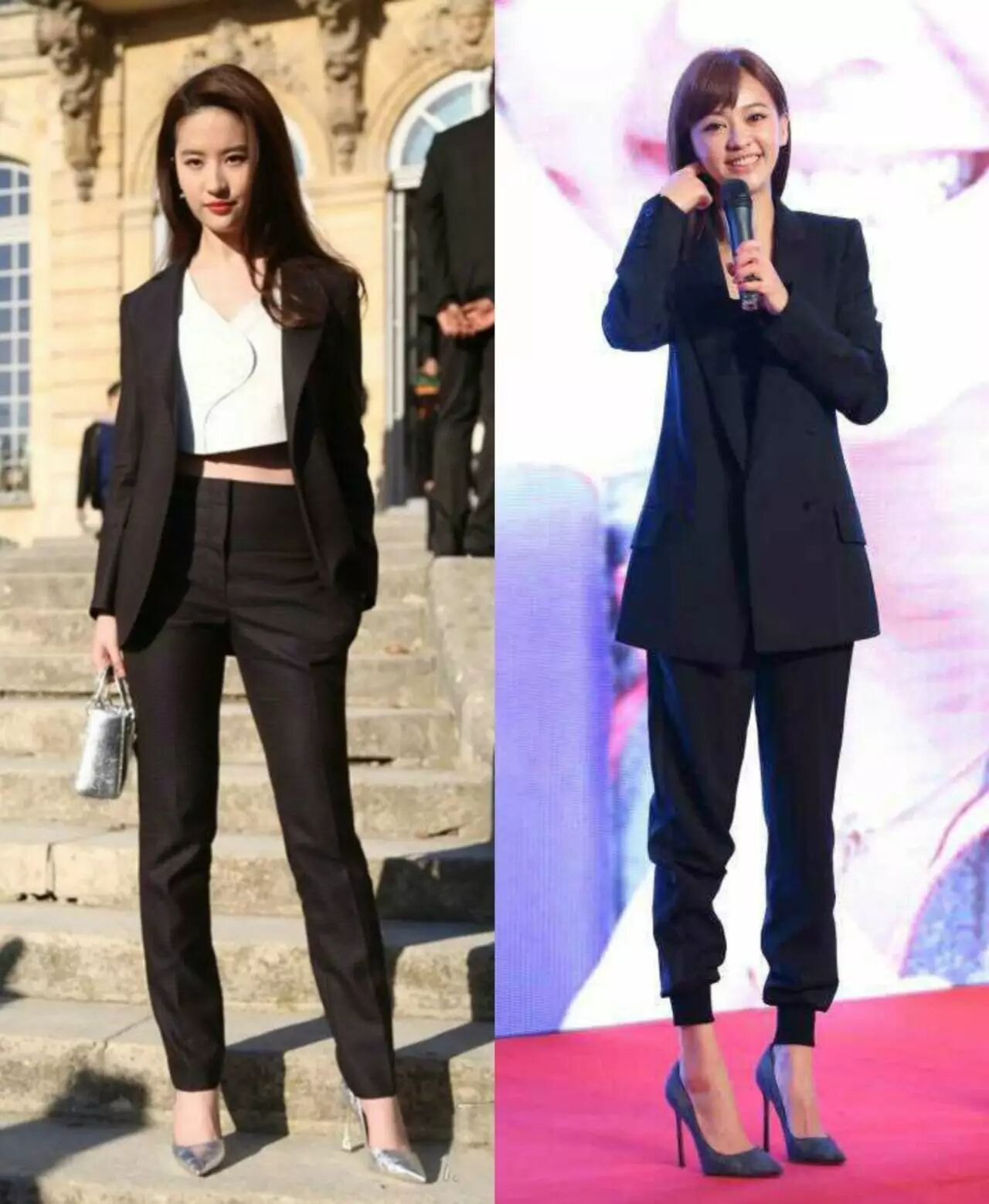 对比下面左右两张图,不难发现左边神仙姐姐刘亦菲的整套西装更贴身,而元气少女陈意涵的整套装扮看起来就有些宽松且不精神了。