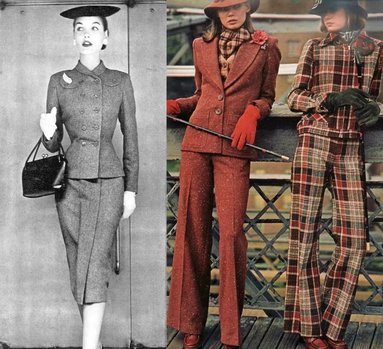 羊毛西装外套是众多面料款式中很普及的一款。早在50年代的欧美,铅笔裙就已经成为了女性日常着装的一部分。1960年代,西裤更为普及。女性就经常穿着羊毛西服套装去工作,约会,和娱乐。