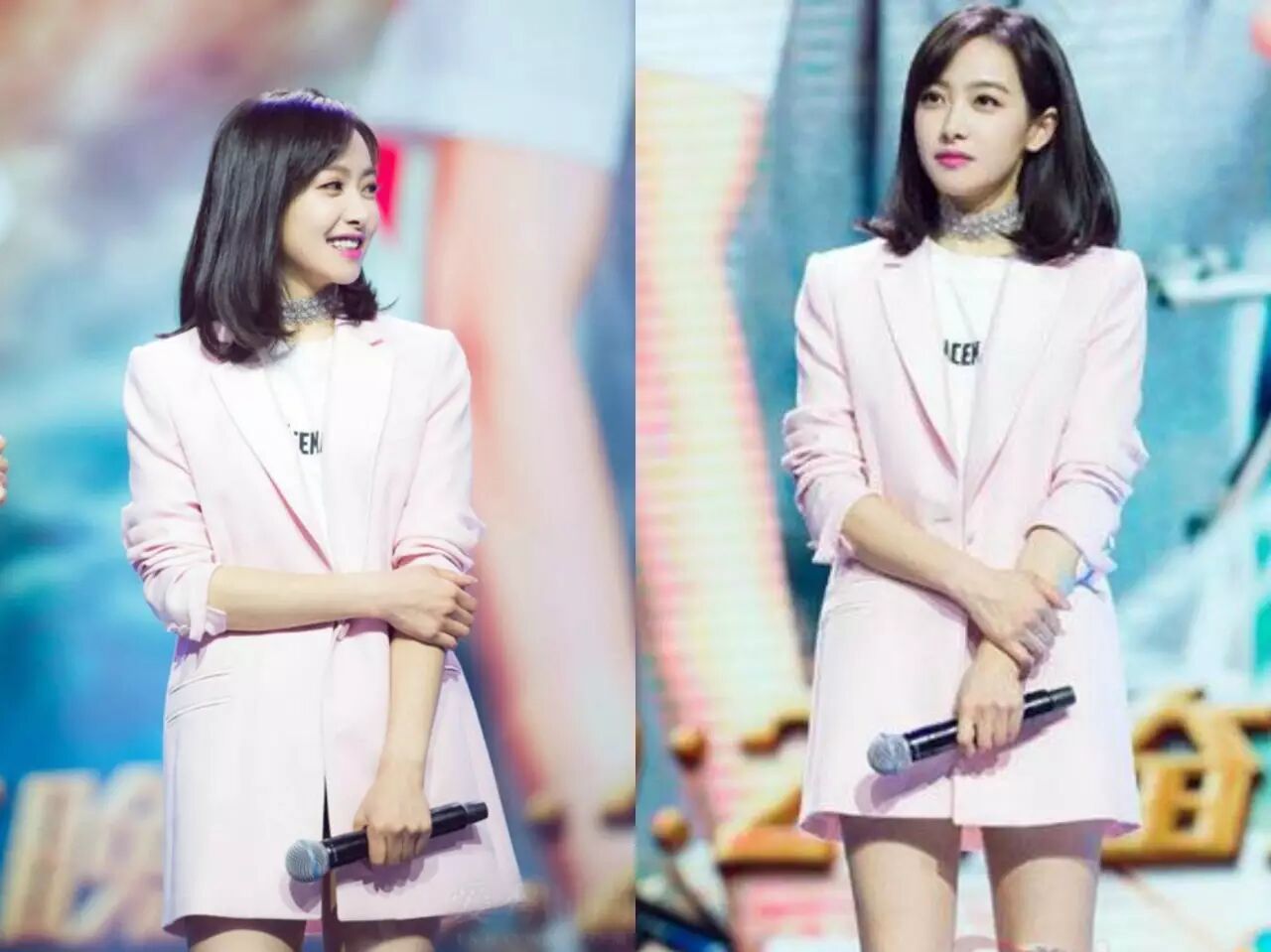宋茜这件晶粉色西装好减龄。里面用简单的T恤裙打底就够了。
