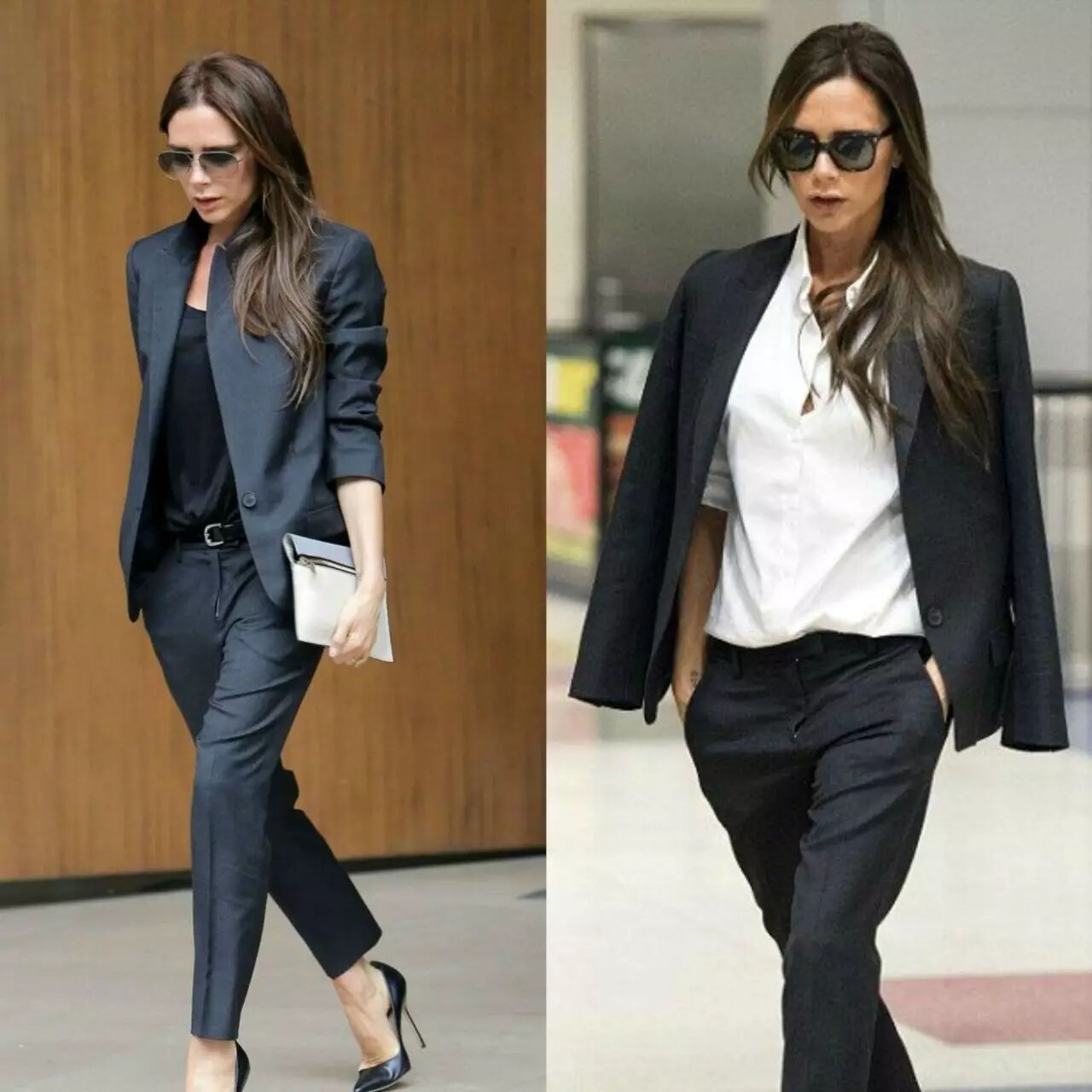 维多利亚·贝克汉姆的这两张街拍也是实用了最经典的穿搭风格。深色外套+内搭衬衣永远都不会错。
