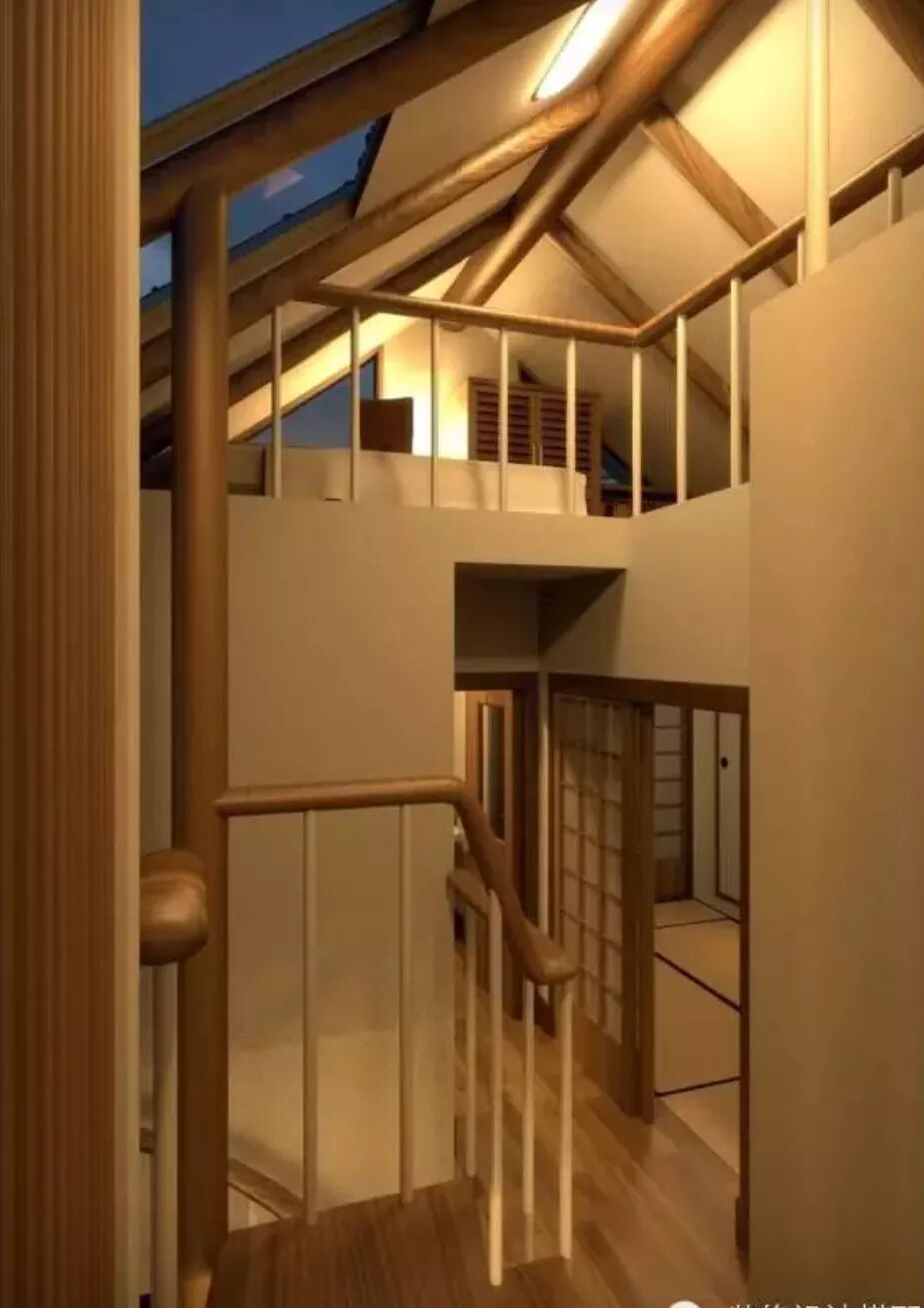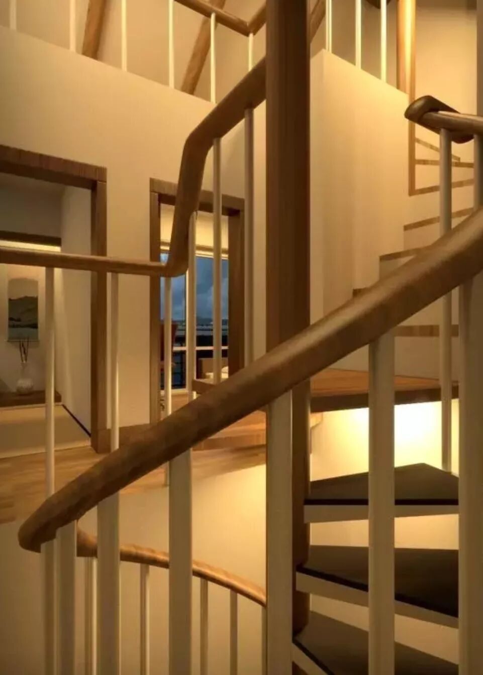 这次设计,难度最大的就是这个旋梯,大家可以看到是先旋高两级停一停,接驳上三楼阁楼的楼梯,再旋下两级到二楼楼面,这样从一楼上来时梯子就不会顶头,也能方便接驳三楼楼梯~