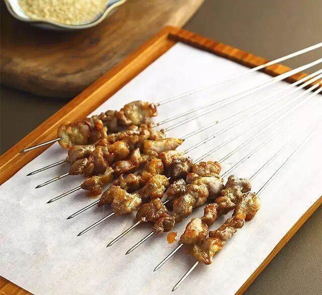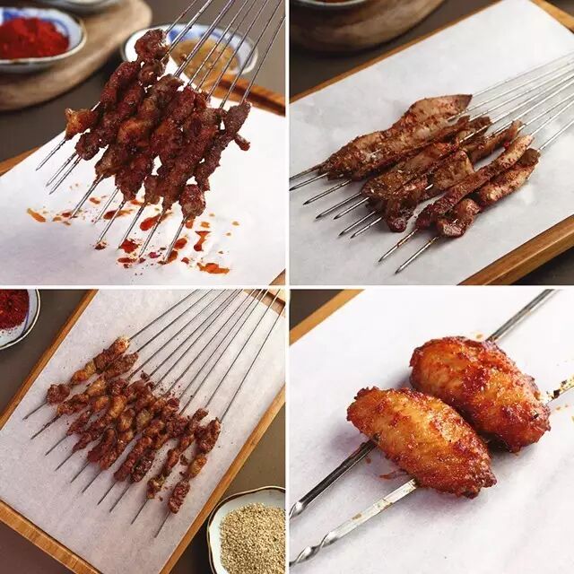 西安烤串儿的做法是把牛羊肉切成薄片,肥瘦相间串在铁签子上,待到烤至焦黄撒上盐、辣椒、孜然等调味。