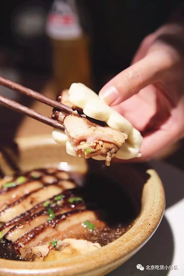 乍一看有点扣肉的意思,肥瘦相间的五花肉颜色酱红油亮,汤汁粘稠鲜美。夹在店里自制的荷叶饼里吃,岂止一个香字了得!