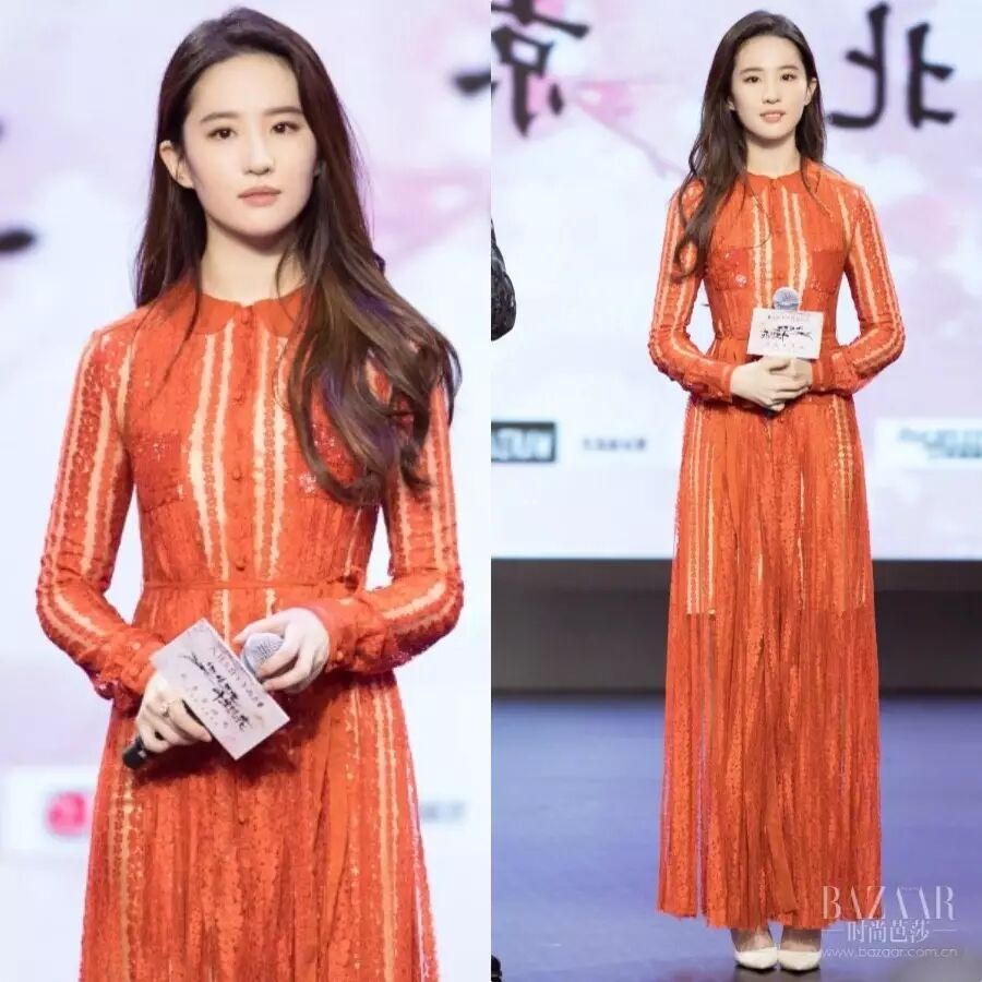 不论是这件热烈的橘色镂空连衣裙还是少女感的荷叶边连衣裙,都尽显了刘亦菲大方典雅的气质。