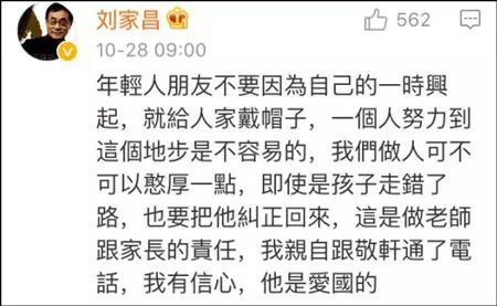 恩师刘家昌也在微博上说,“即使孩子走错了路,也要把他纠正回来,我亲自跟敬轩通了电话,我有信心,他是爱国的”。