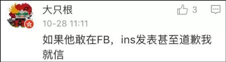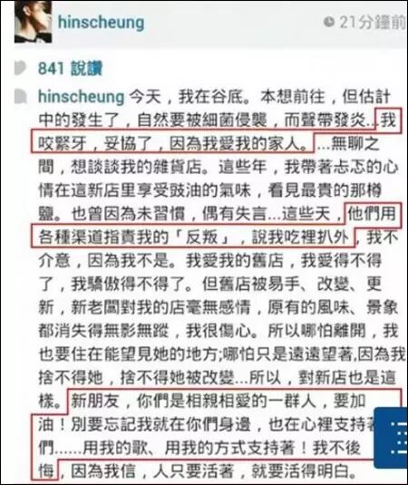 因为这些言论被内地网友指责的时候,他继续在Instagram上说:虽然我为了家人妥协了,但我依旧在你们(指“占中”暴徒)身边,在心里支持你们,用我的歌、用我的方式支持着,我不后悔。