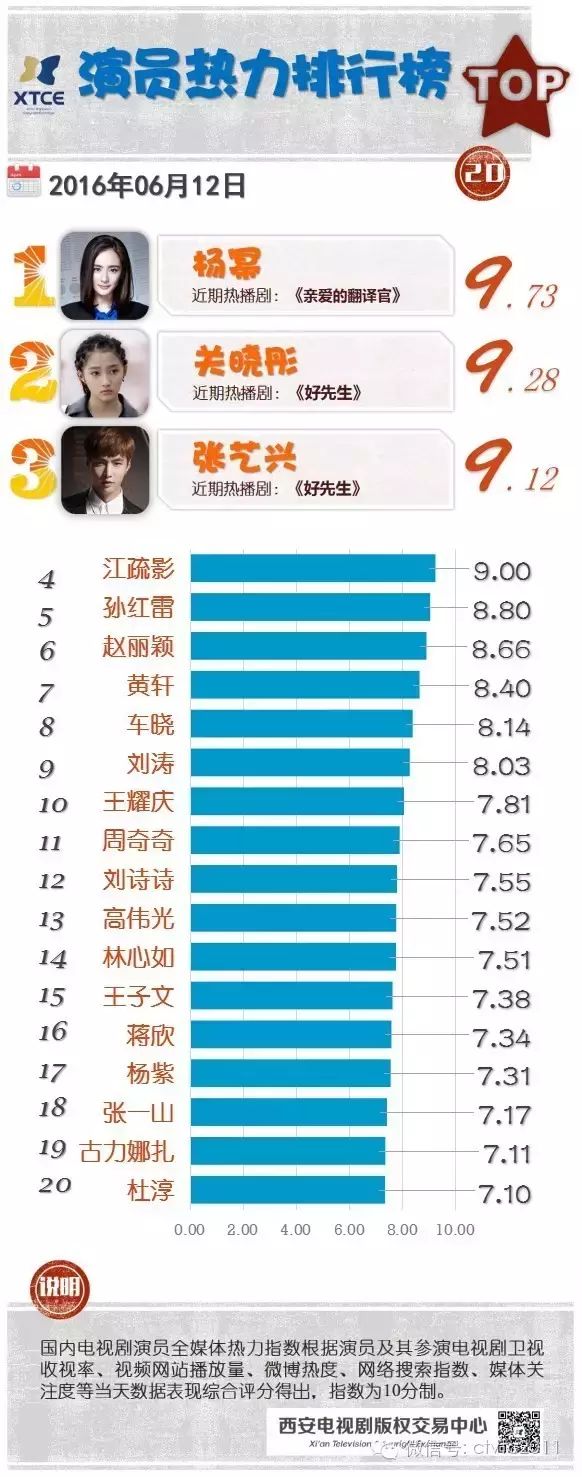 ★/西安电视剧版权交易中心影视数据评估中心通过监测国内电视剧演员及其参演电视剧卫视收视率、视频网站播放量、微博热度、搜索指数、媒体关注度等实时数据表现(每日00:00:00—23:59:59),运用综合评价算法计算评分,特推出“国内电视剧演员全媒体热力排行榜 TOP20”。/★