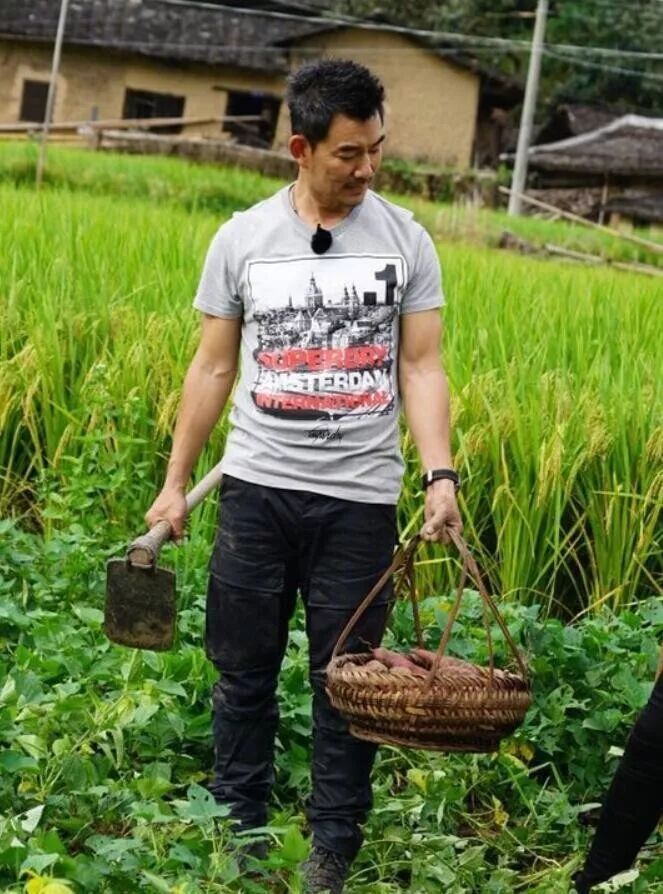 你没看错,这个穿着朴素,手里拎着锄头挖地瓜,还开拖拉机的是任贤齐,那个唱《伤心太平洋》、《心太软》的任贤齐。
