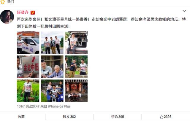 昨晚任贤齐发了微博说明了行程:到永春是走访余光中老师故居,得知余老思念故乡的地瓜,特别下田体验了一把农村田园生活。