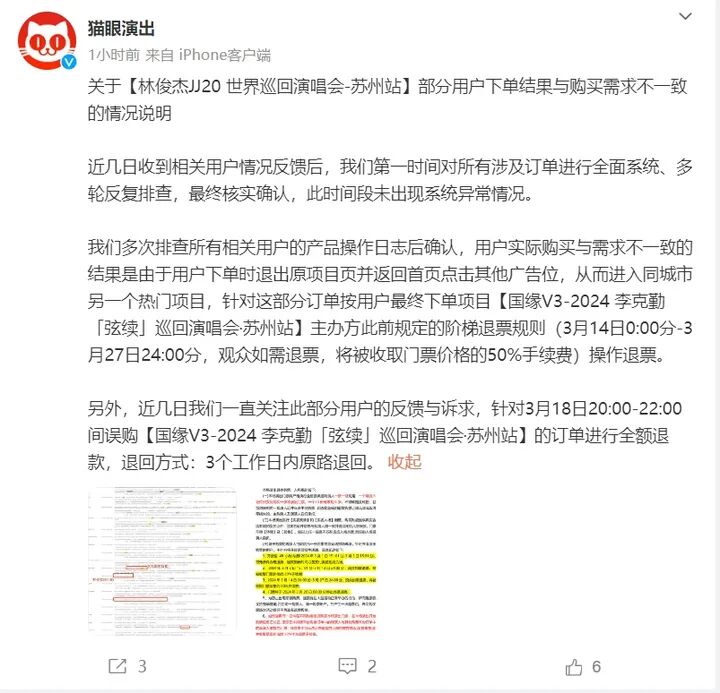 在潮新闻与猫眼多次沟通后,3月23日,猫眼演出官方发出公告,与多方协商最终达成取消对这部分用户收取手续费决定。公告表示,针对3月18日20:00-22:00间误购【国缘V3-2024 李克勤「弦续」巡回演唱会·苏州站】的订单进行全额退款,退回方式:3个工作日内原路退回。