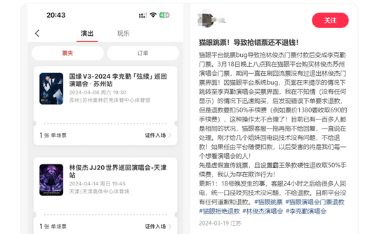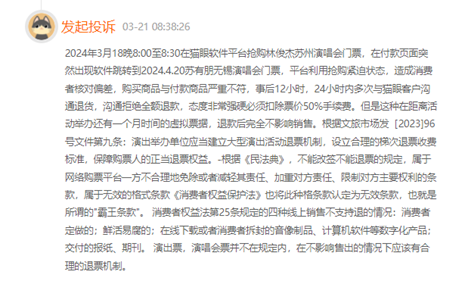 记者查询发现,还有不少消费者投诉猫眼跳票,导致购票错误,须承担高额退票费。一名“买错”成苏有朋演唱会的网友认为,平台利用抢购紧迫状态,造成消费者核对偏差,导致的购买商品与付款商品严重不符。