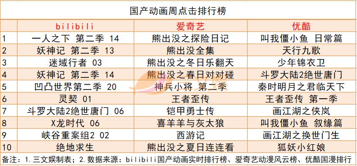 本周优酷榜的第一名是《叫我僵小鱼 日常篇》,同一个系列的《叫我僵小鱼 叙缘篇》也进入前十榜单。《王者歪传》也是一个以《王者荣耀》为原型的动画。《斗罗大陆2绝世唐门》排名第4,是一部动态漫画,在B站榜单中排名第7。