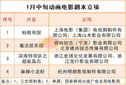 1月中旬动画电影剧本立项有4部,而1月下旬的没有动画电影剧本立项。这4部电影,从剧本上来看,都属于低幼向动画,而且都有动物形象出现。《蚂蚁帝国》、《魔法鼠乐园》和《麻辣小龙虾》自然不必说,《深海特工队》里面其实还出现了一个龟博士。