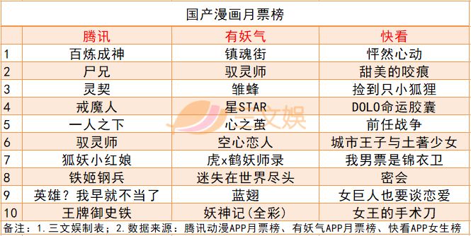 国产漫画方面,腾讯榜榜首还是《百炼成神》,周月票为1.3万,紧随其后的是《尸兄》,周月票数量在也在1万以上。但是第3名《灵契》的周月票数量就降至5000多票。接下来的进入前10名的漫画都是老面孔了。基本上他们的人气值都在30亿以上,有几部漫画已经动画化了。
