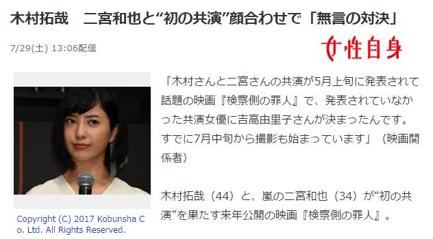 最后是今年夏天的,木村拓哉和二宫和也首次共演的《检察官的罪人》拍摄时的周刊新闻。由于之前属于J家两大帮派以及首次共演,被出了很多条新闻。